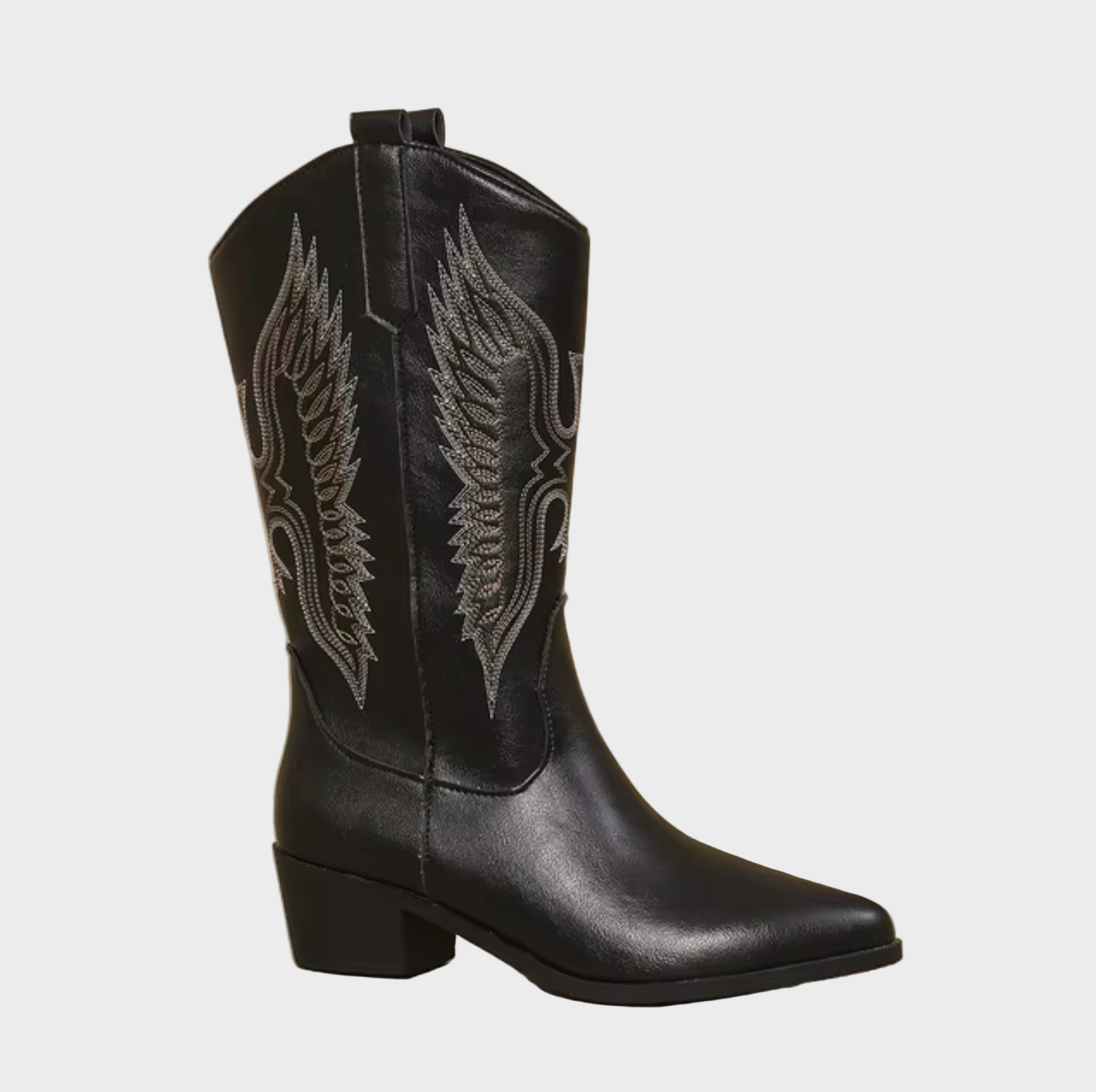 Dámské western boty z černé kůže s působivými šedými výšivkami peří. Špičatý design a stabilní čtvercový podpatek dodávají klasický kovbojský charakter, zatímco detail ve výšivce přináší dynamický a jedinečný vzhled. Ideální pro kombinace s džínami nebo šaty pro výrazný vzhled.