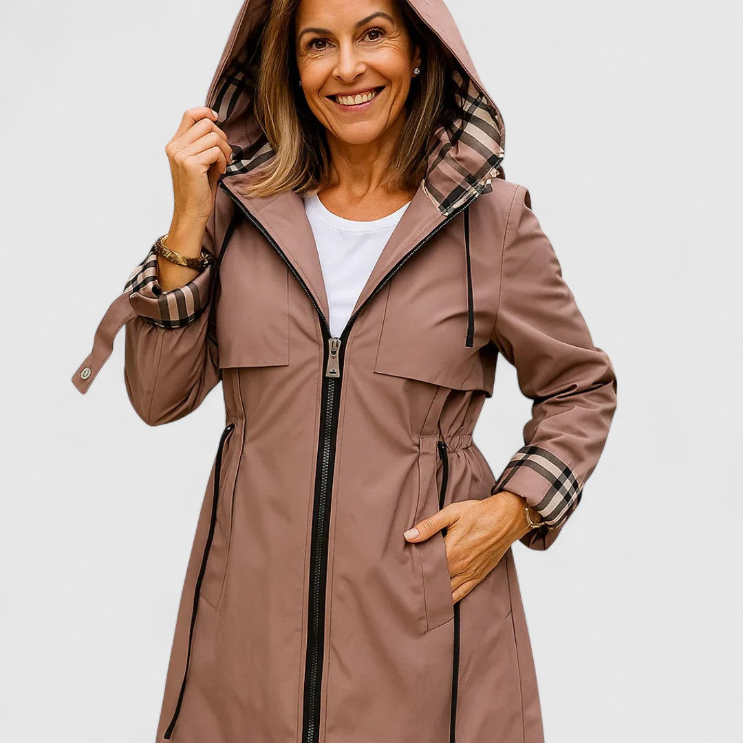 Elegantní a funkční kabát s integrovanou kapucí, dvoucestným předním zipem a kapsami s patkou pro bezpečné uložení nezbytností. Příjemná, odolná tkanina zvládne každodenní nošení, zatímco nastavitelný pásek a řemínky na manžetách vám umožní upravit siluetu podle potřeby. Podšívka s klasickým vzorem dodává nenápadnou sofistikovanost. Ideální do práce, do města i na cesty.