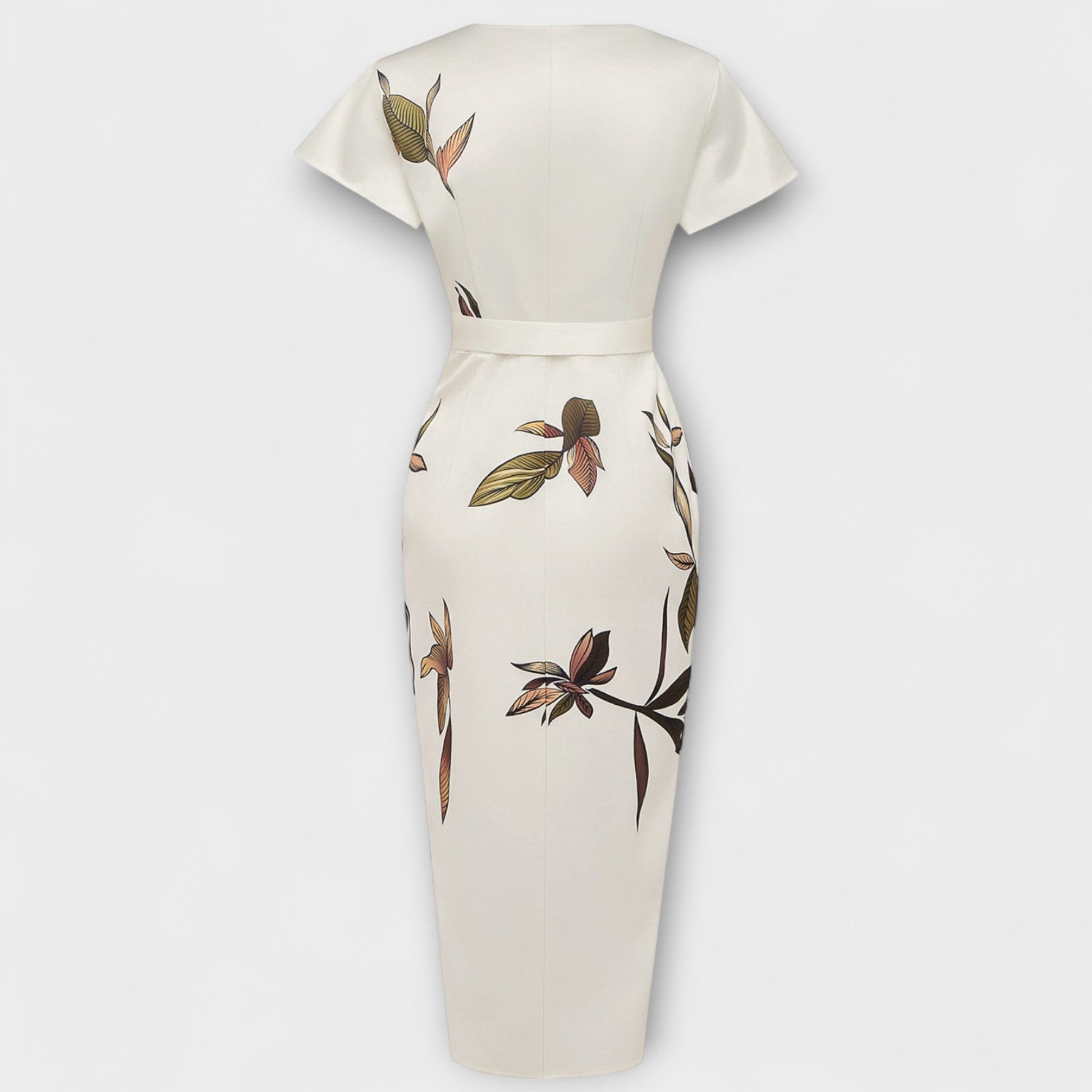 Okouzlující zavinovací midi šaty s živým listovým potiskem a lichotivým V-výstřihem. Ideální pro jakoukoli příležitost, od brunchů po venkovní akce.