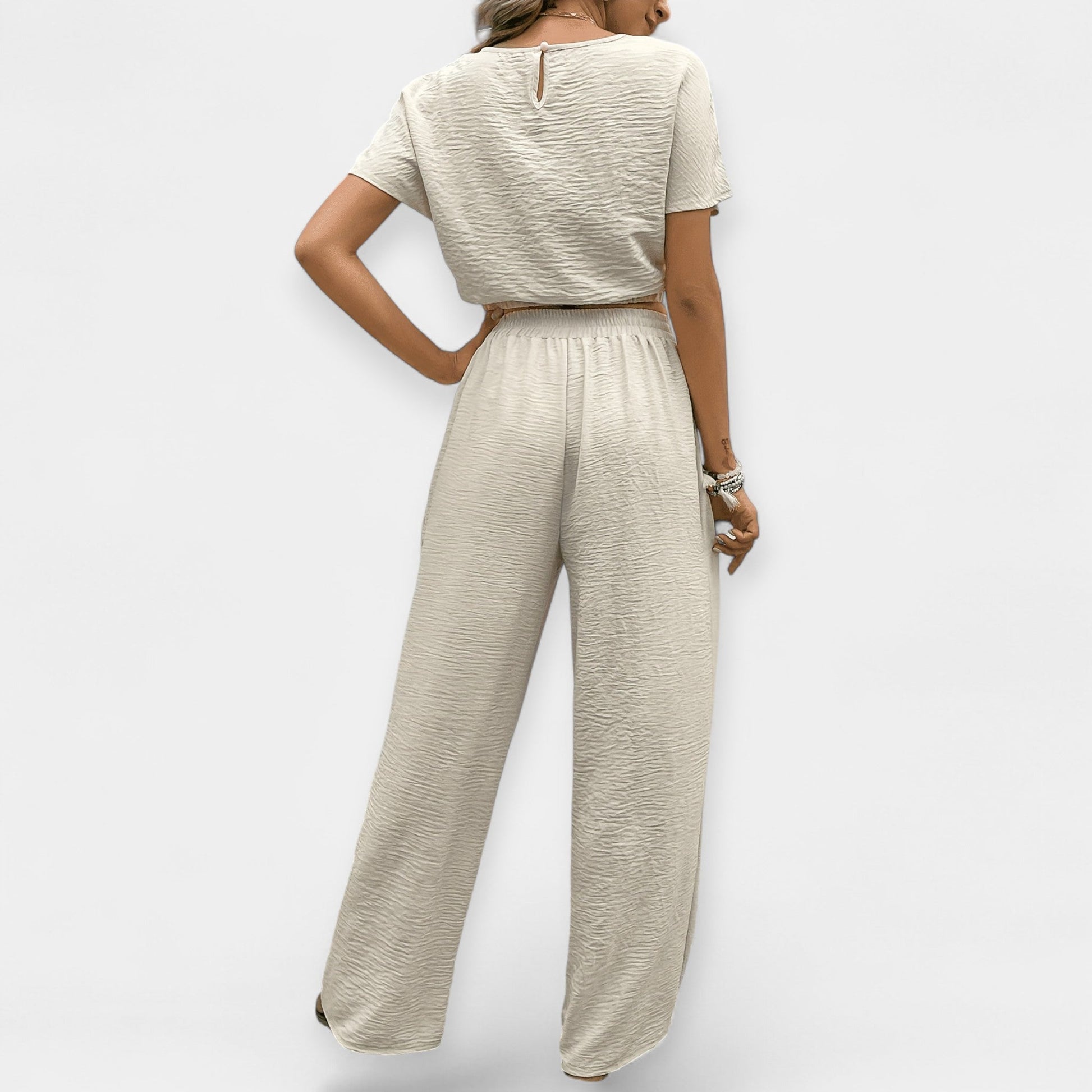 Tento set vyniká volným střihem a naprostým pohodlím, které nabízí. Krátký top s nafouklými rukávy se harmonicky kombinuje s vysokým kalhotami s tkaničkou, čímž vytváří stylový vzhled s boho akcenty – ideální pro nejteplejší dny v roce.